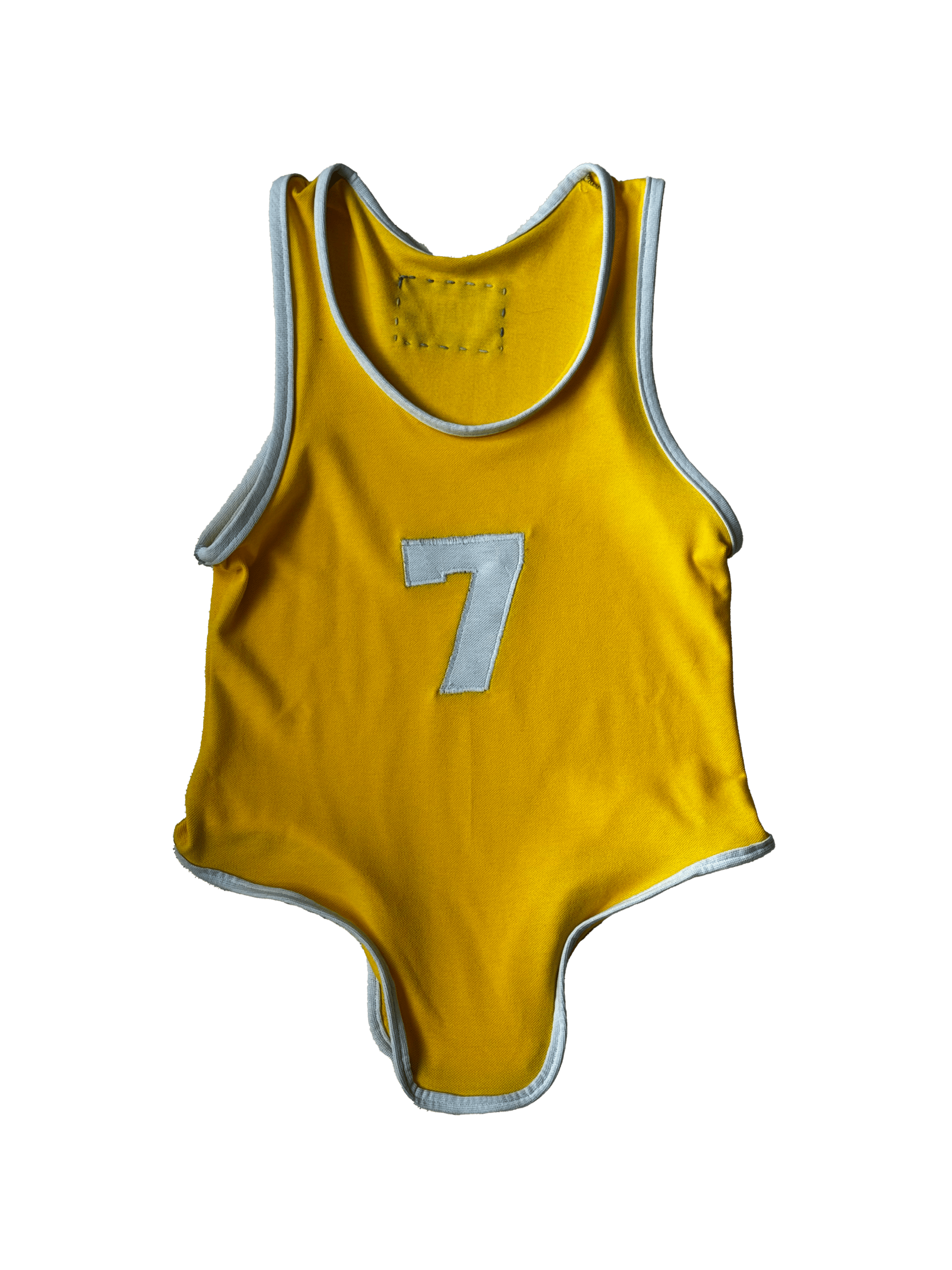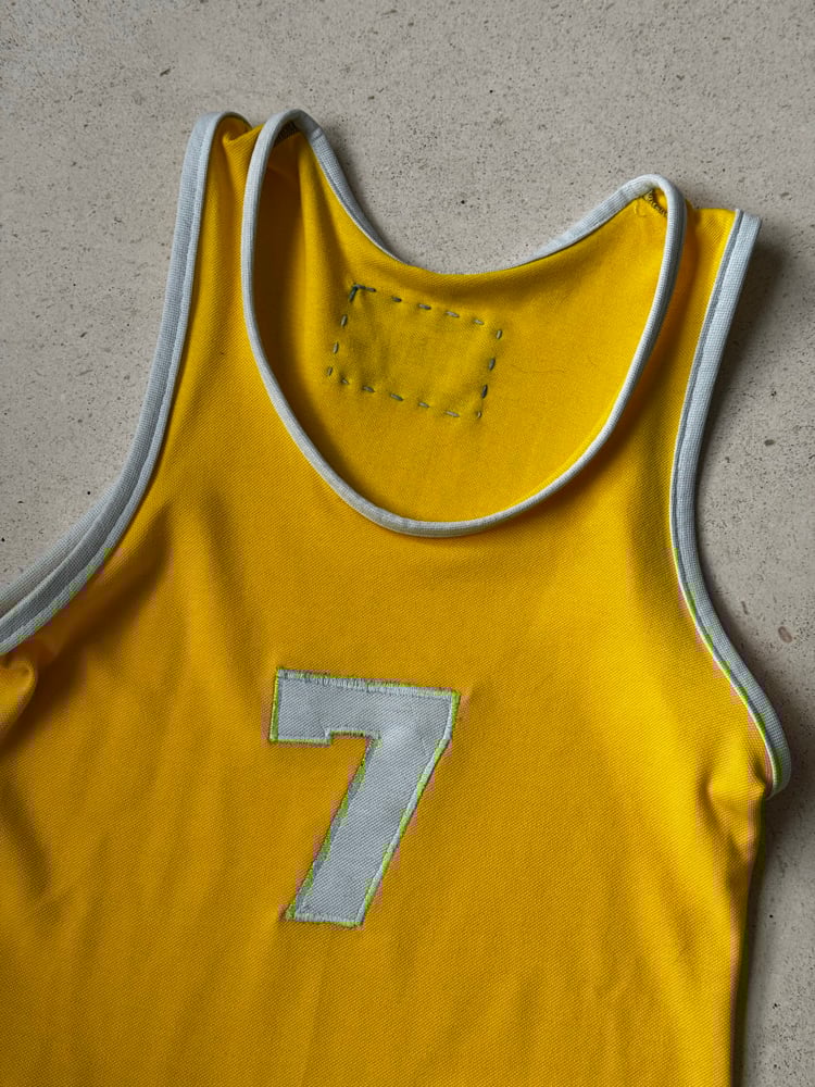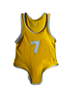 Yellow cheerleader tank top with embroidered number “7” in white and binding at the edges.