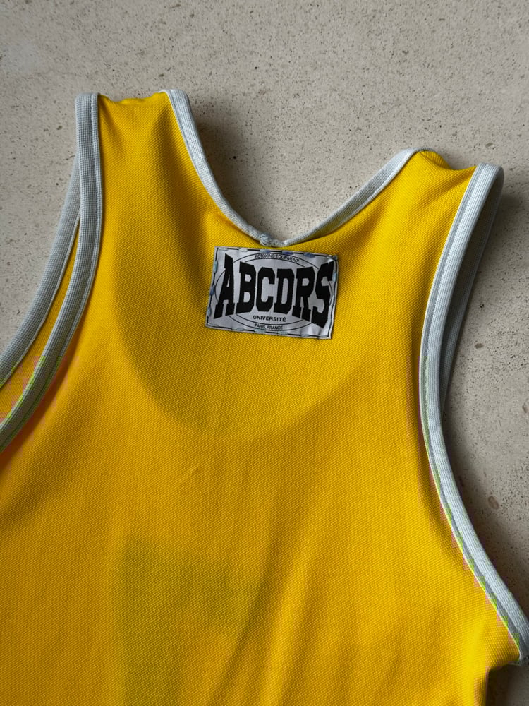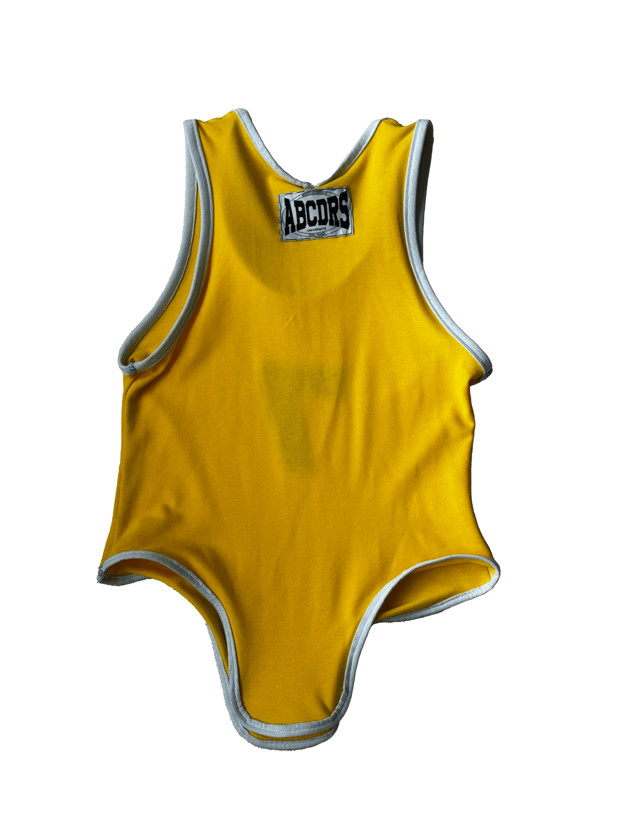 Débardeur de pompom girl jaune, numéro 7 brodé en blanc, biais aux extrémités du vêtement.