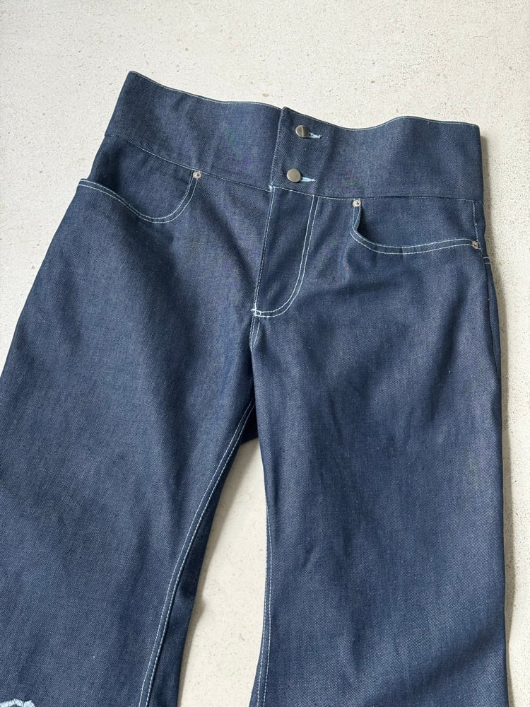 Pantalon 100% coton bleu à lacets. Cousu à la main à Paris.