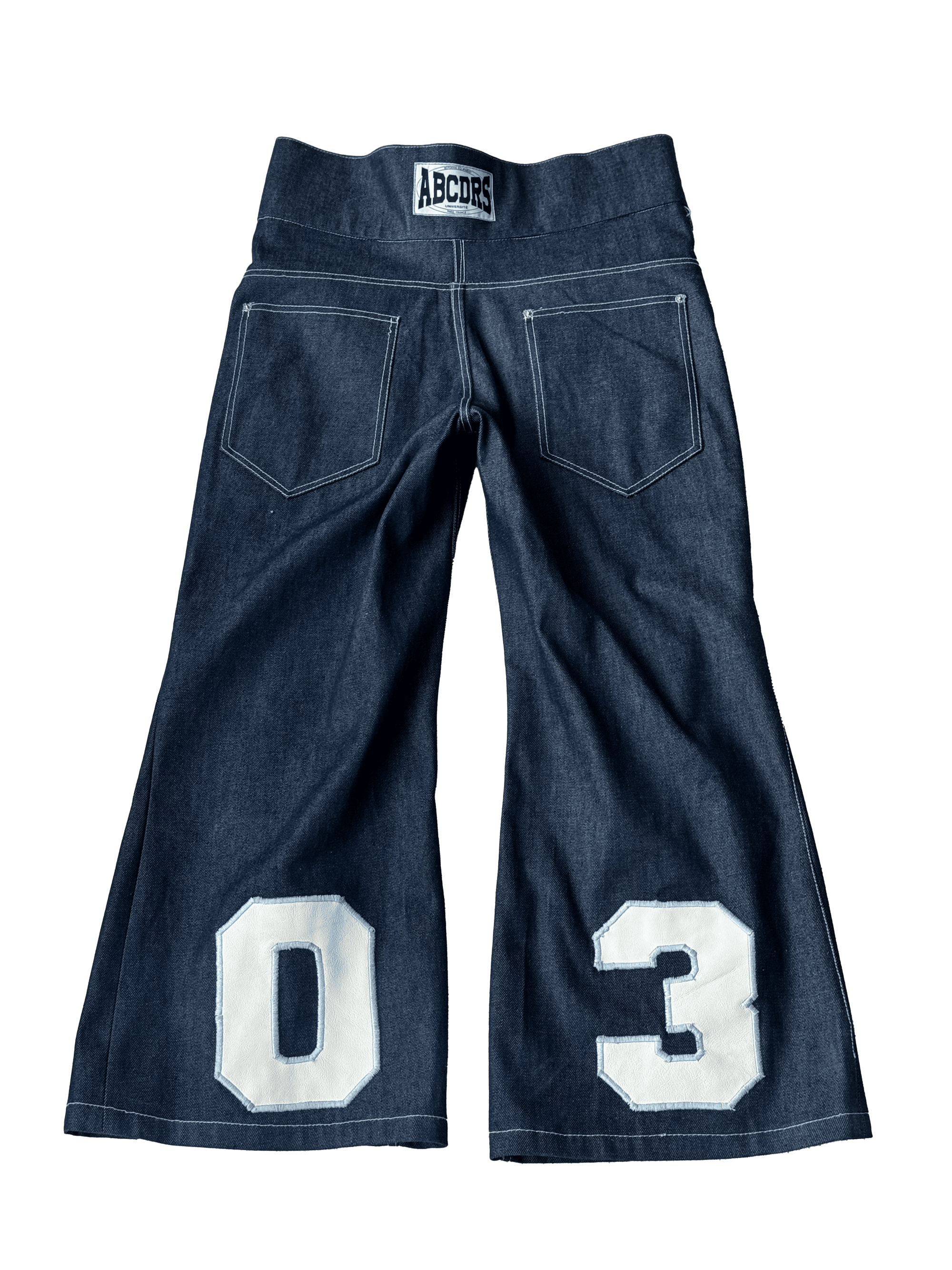 Jean brut à coupe droite. Denim brut bleu, et lacets de serrage blancs à la taille. Ceinture haute et broderie "03" à l'arrière du produit.