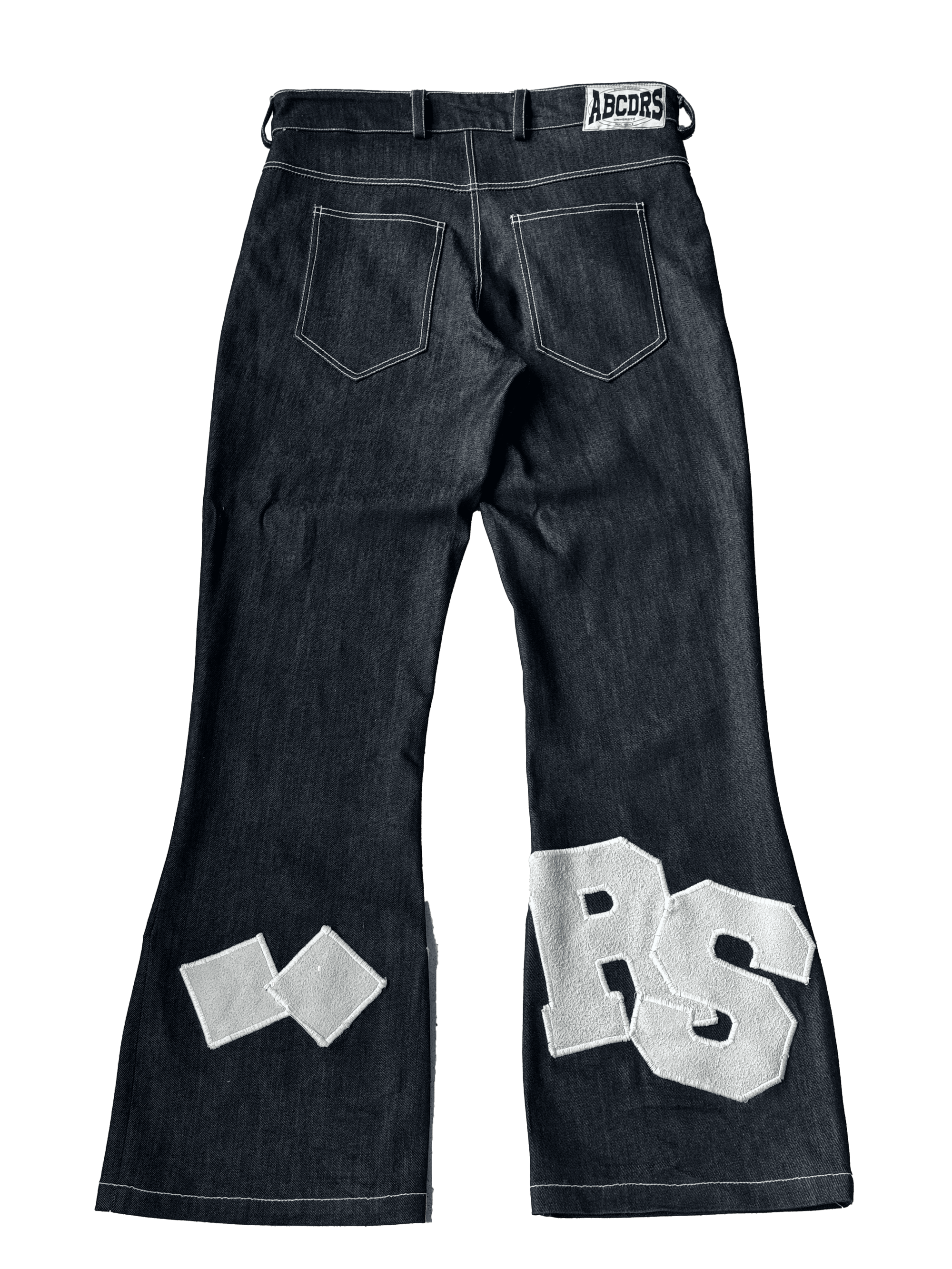 Raw denim jeans with white topstitching. Leather letter embroidery “ABCD” on the front, “..RS” on the back.