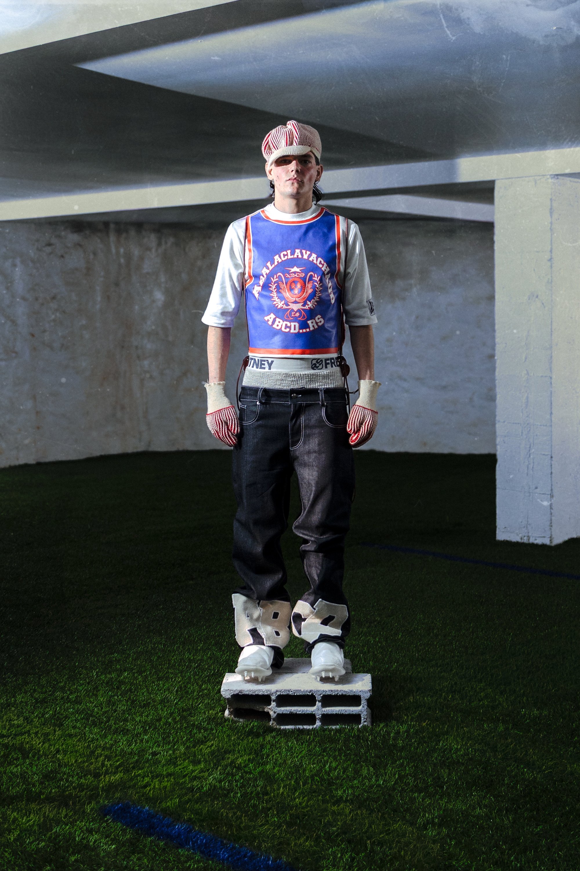 Jean en denim brut et à surpiqures blanches. Broderies de lettres de cuir "ABCD" sur le devant, "..RS" sur le dos.