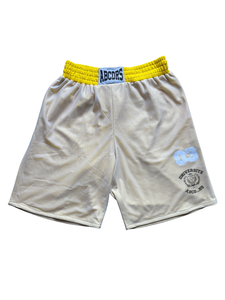 Modern football shorts with multiple panel cuts and different shades of yellow. Number 03 and « Université ABCDRS » logo on the front.