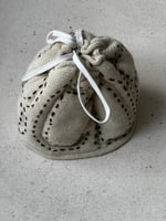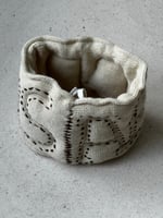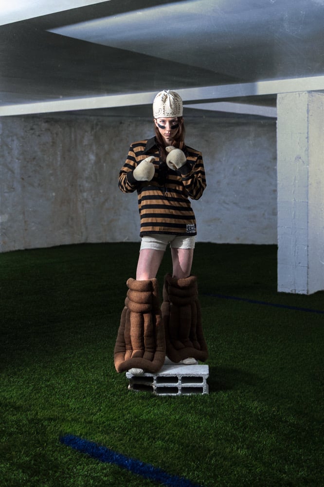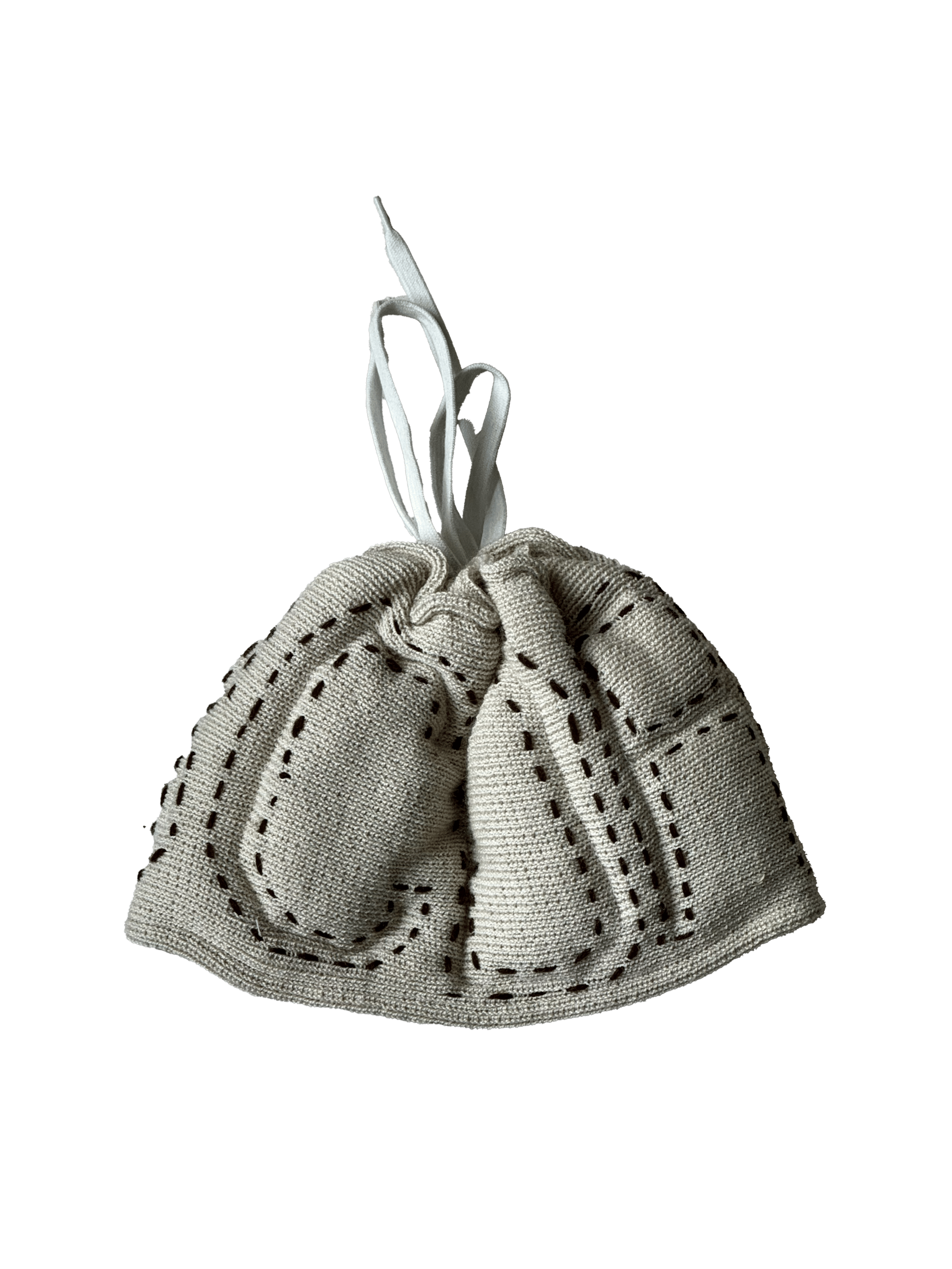 Padded beanie with a drawstring at the top for adjustable styling. “ABCDRS” knitted into the fabric.