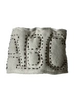 Bonnet rembourré, avec un lacet de serrage en haut pour varier les options. L'écriture "ABCDRS" est tricoté sur le produit.