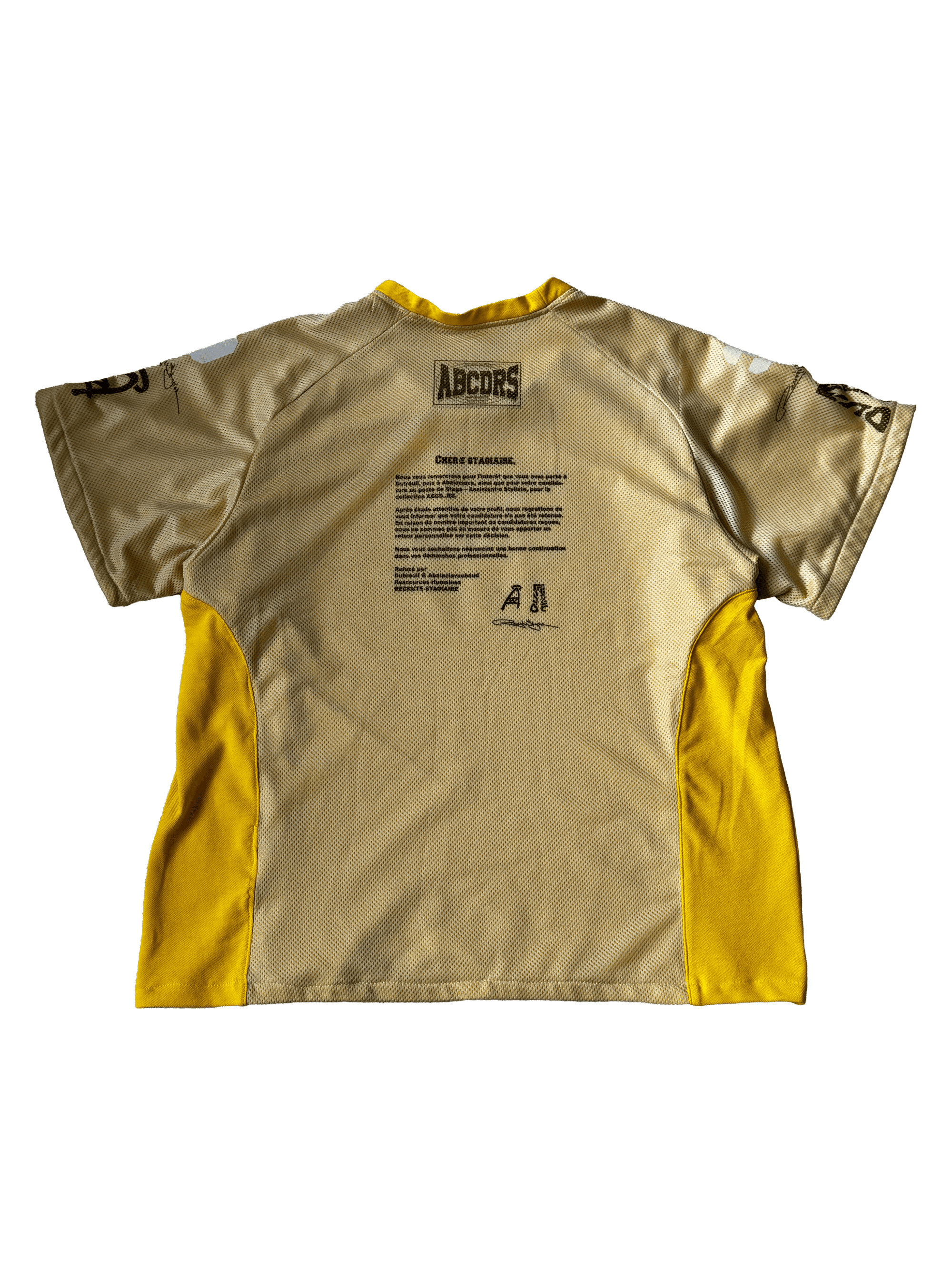 Maillot de football modern avec nombreuses découpes et différentes teintes de jaune. Lettre de refus de stage imprimée à l'arrière, logo "université ABCDRS" à l'avant.