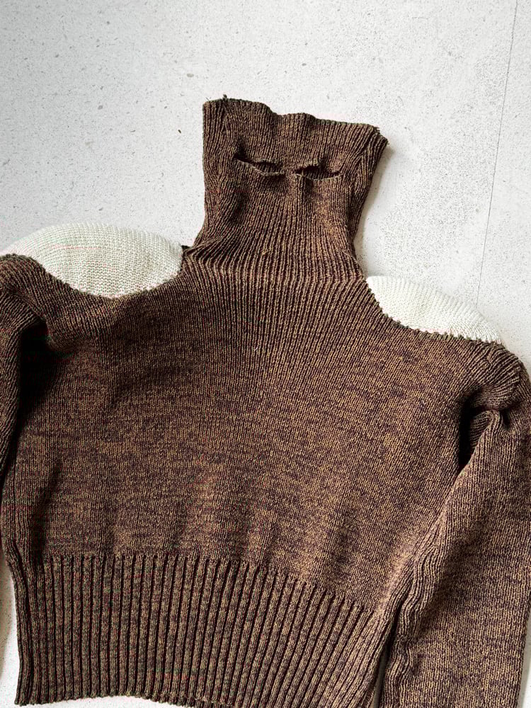 High-neck sweater that can be converted into a hood. Cropped fit with long sleeves. Large beige protective shoulder pads.