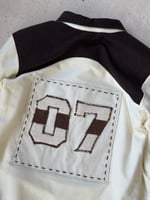 Rugby-style fleece sweatshirt, fully lined with shoulder pads. Drawstring at the neck. Wool embroidery “07” on the back.