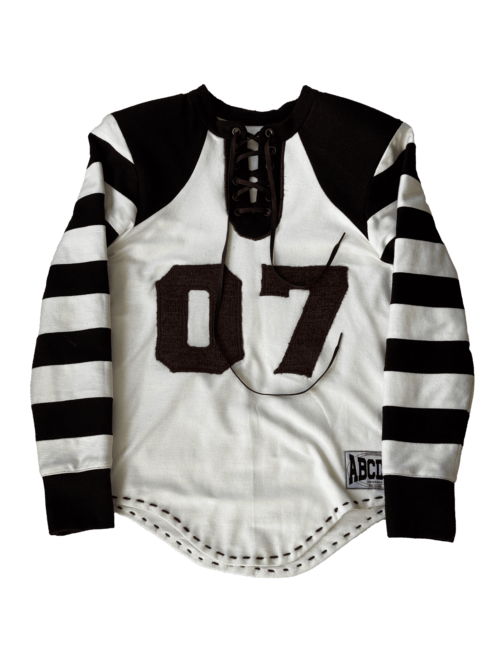 Rugby-style fleece sweatshirt, fully lined with shoulder pads. Striped detailing on the sleeves and drawstring at the neck. Wool embroidery “07” on the front and “ABCDRS” on the back.
