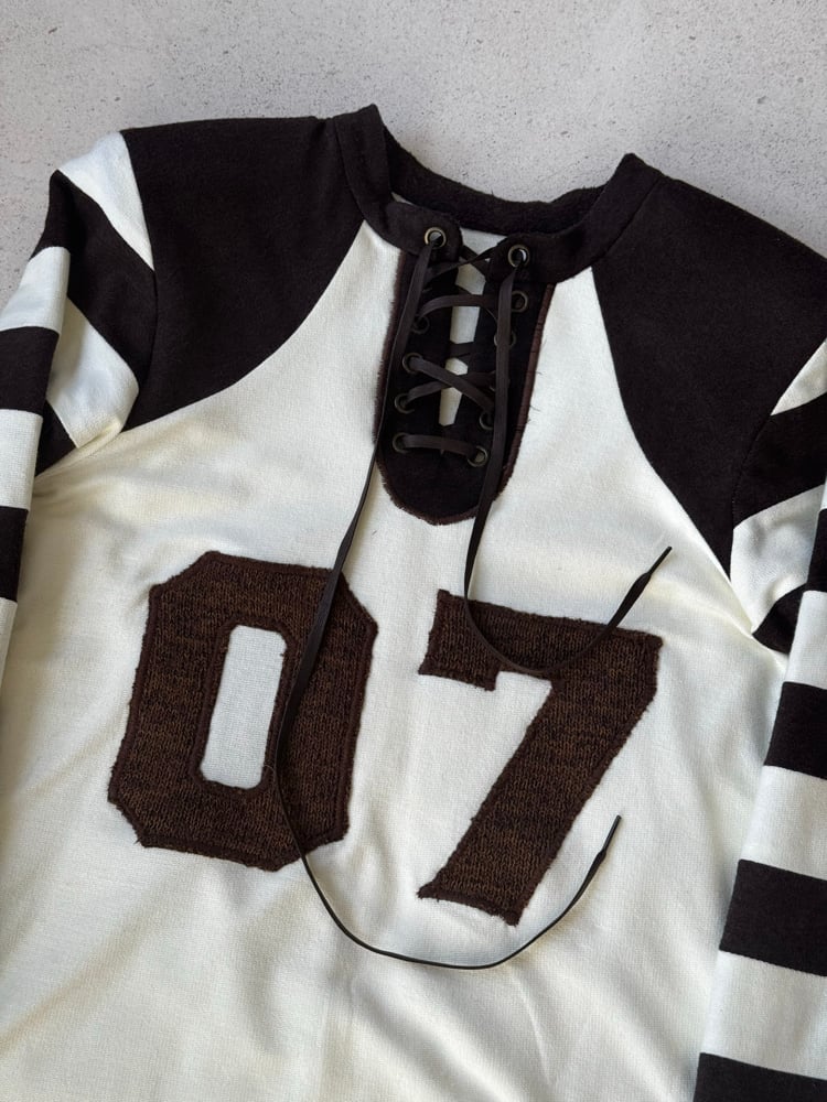 Sweat maillot de rugby en molleton entièrement doublé avec épaulettes. Marinières aux manches et lacets de serrage au col. Broderies de laine "07" sur le devant et "ABCDRS" au dos.