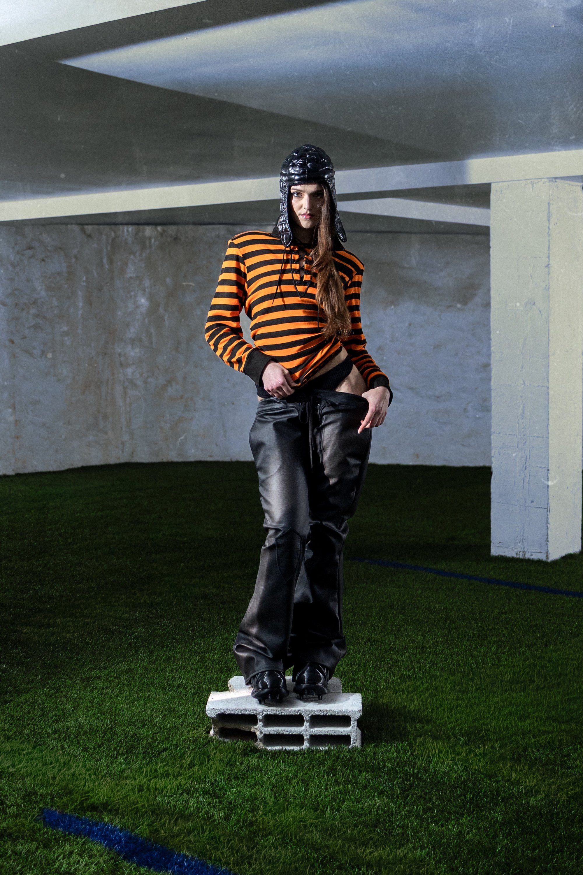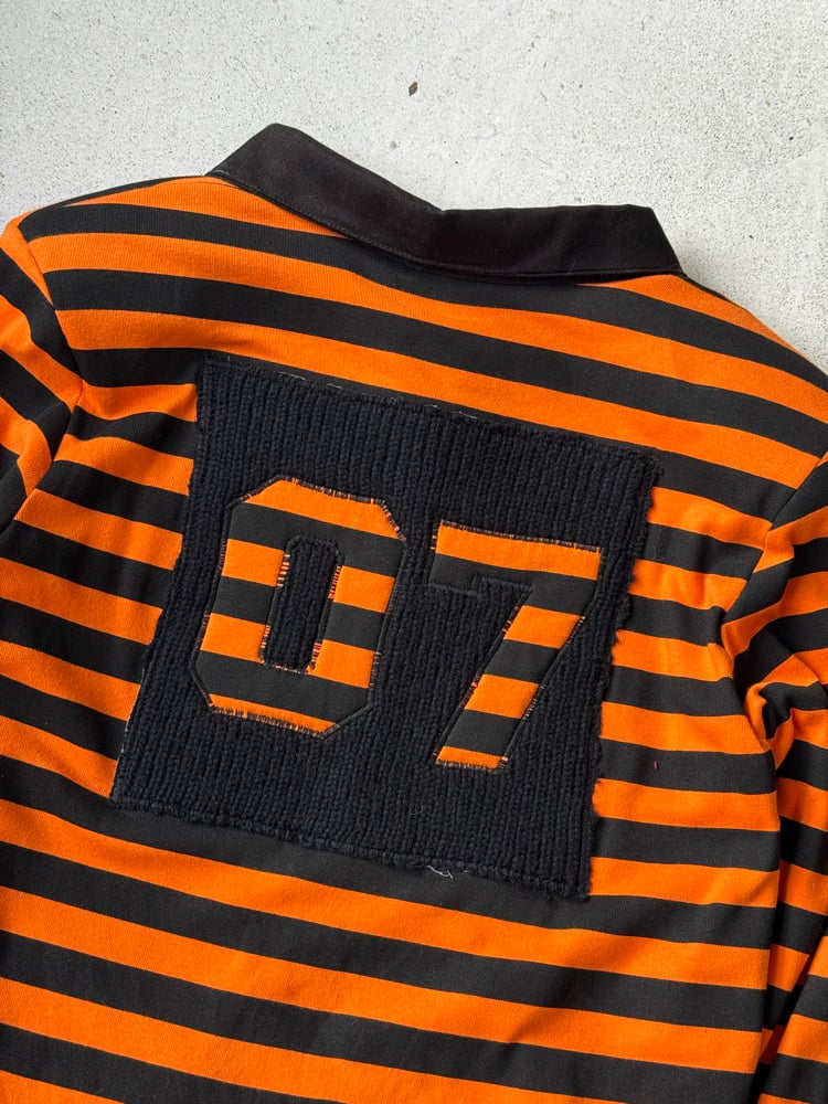 Striped long-sleeve polo. Wide collar with drawstrings. Wool embroidery “07” on the front and back.