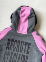 Hoodie with a hood trimmed in Balenciaga fur. Pink and grey striped detailing on the sleeves. “ABCDRS University” and “Recrute Stagiaire” prints on the front and back. Fully lined and featuring shoulder pads.