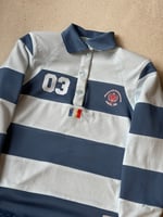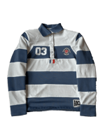 Long-sleeve rugby polo. Blue and white striped design. Fully lined and featuring shoulder pads. French flag print on the back. “ABCDRS University” logo and “03” on the front.