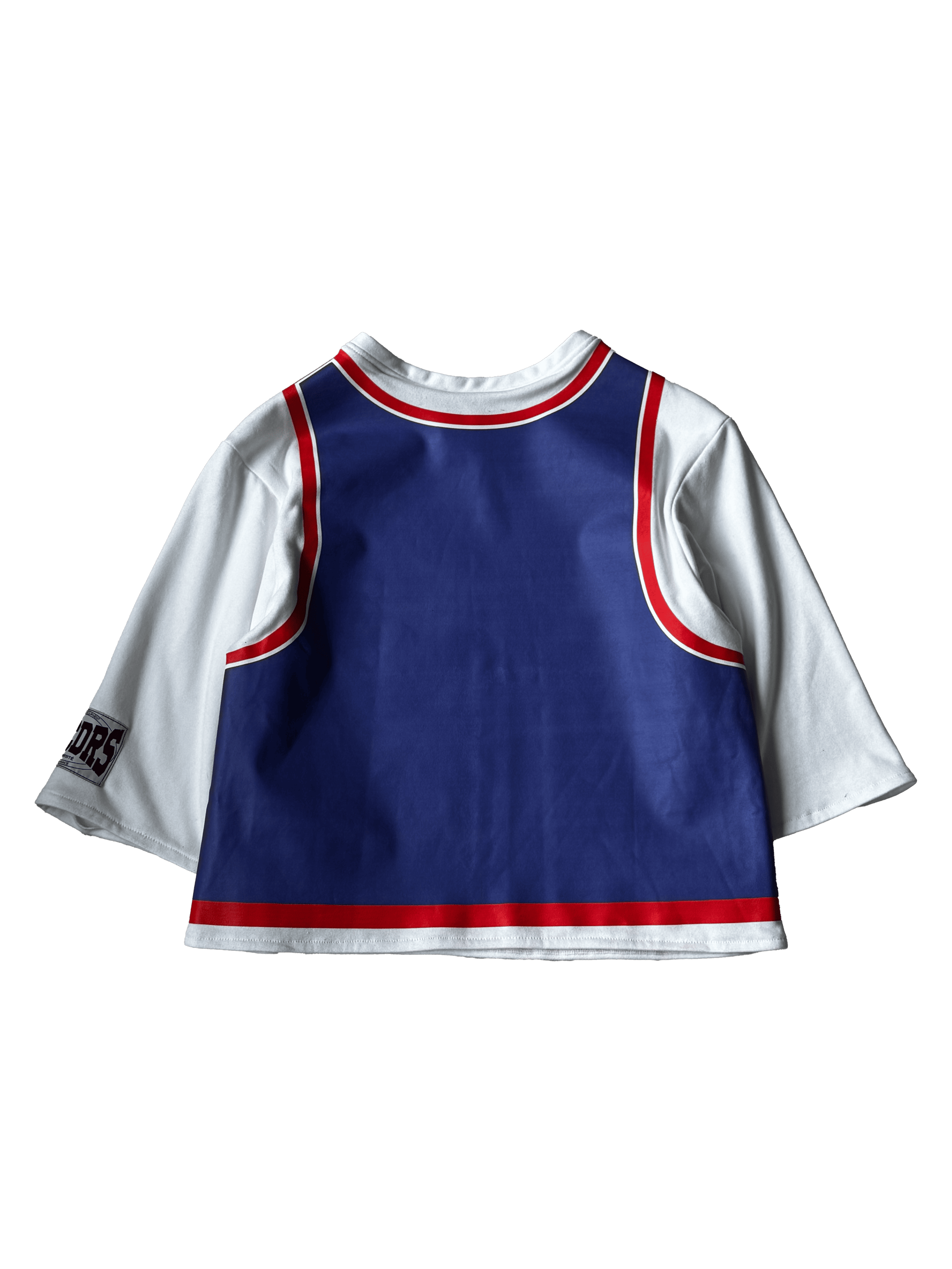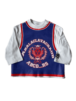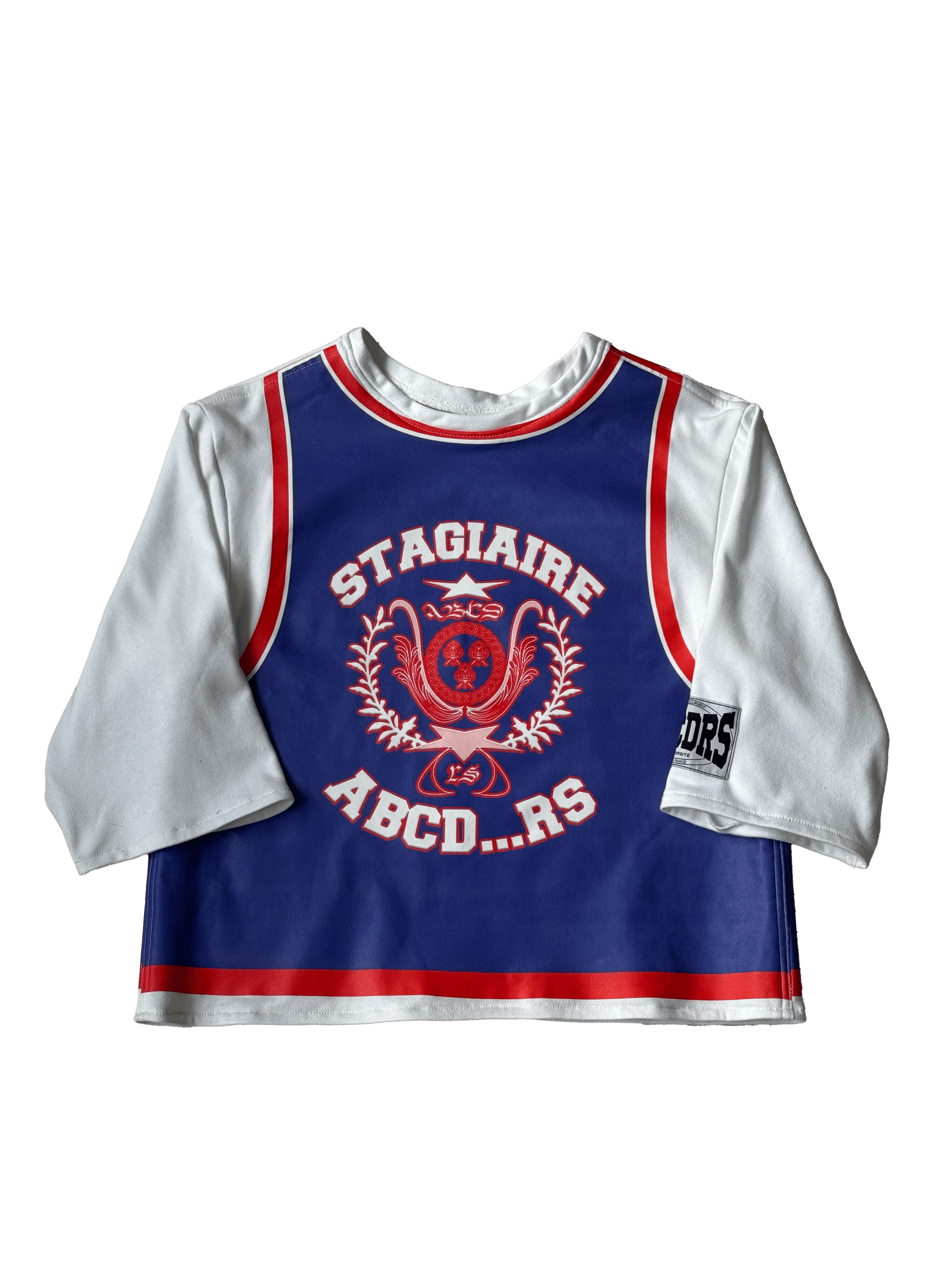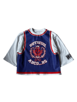 Wide-fit T-shirt with long sleeves and cropped waist. Decorated with a sports jersey-style print. "University ABCDRS" logo is printed on the front.